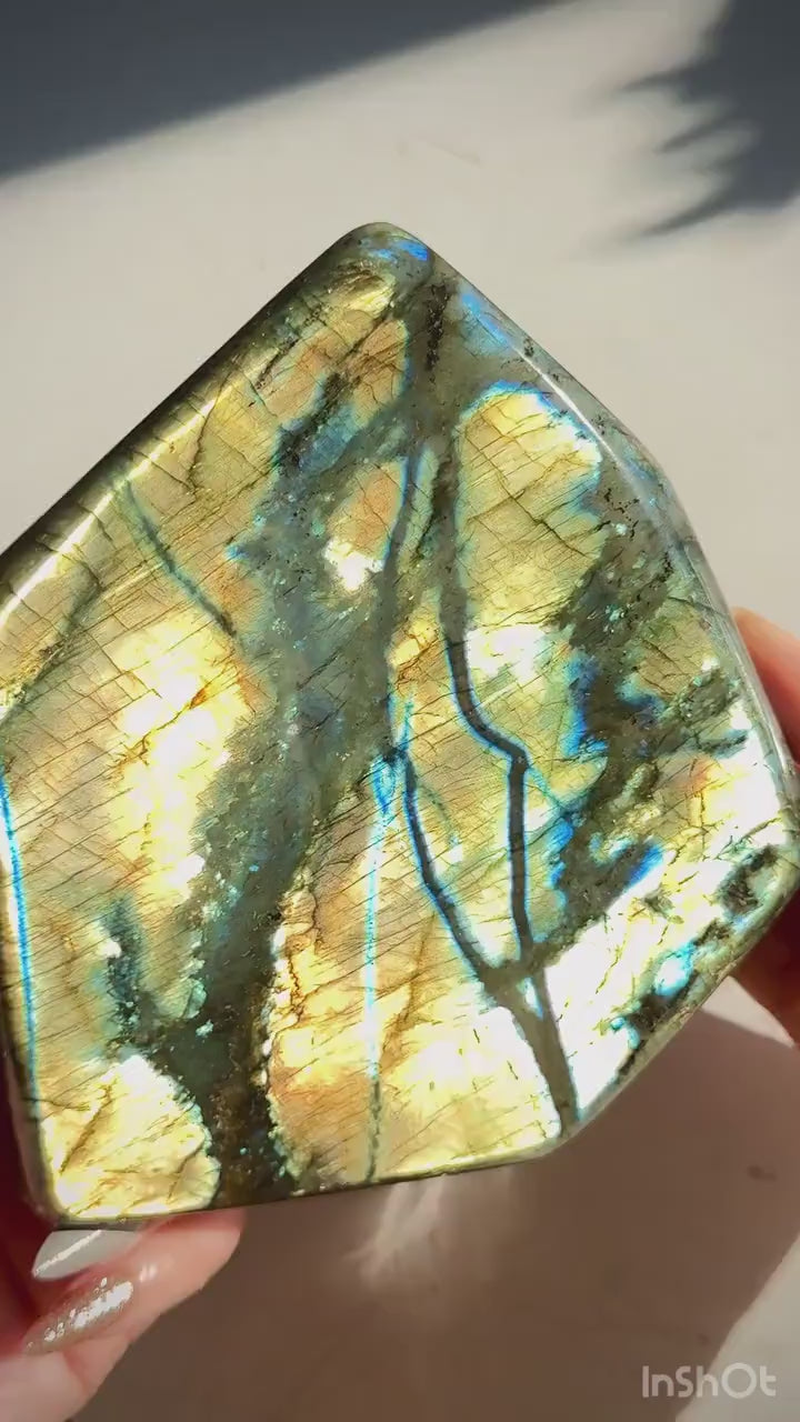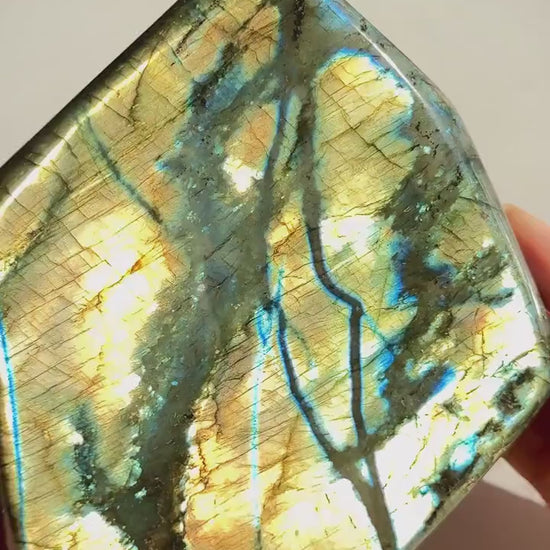 Bring a touch of magic into your space with this stunning labradorite freeform — a polished natural crystal known for its vibrant flash and mystical energy. Each piece is carefully shaped to reveal the stone's natural beauty, with shimmering flashes of blue, green, gold, and even violet dancing across its surface when it catches the light.
