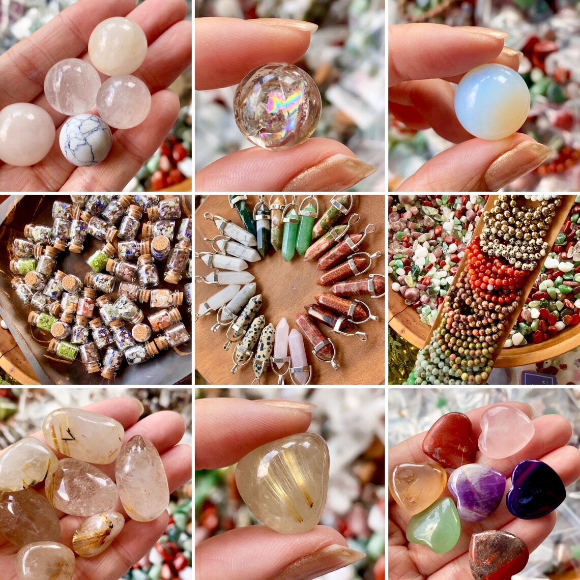 Crystal bead bracelets including howlite, dalmation jasper, faceted pyrite, striped carnelian, red leopard jasper, unakite, kiwi jasper, green aventurine and more